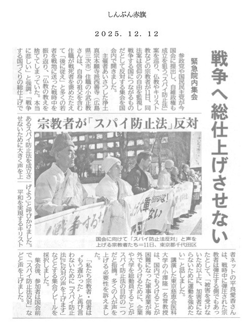 ![]() 12月16日情報 賛同者の皆様 9件お知らせします ★①高市は確信犯 ★②今週の行動予定12/15,17,19 ★③12/16 スパイ防止法院内集会 ★④12/17 子ども甲状腺裁判第16回口頭弁論 ★⑤12/26 女性党首・幹事長の共同街宣 ★⑥来年2/7-8 市民運動全国交流集会@呉 ★⑦スパイ防止法宗教者全国集会 報道とアピール文 ★⑧神戸学生センターニュース ★⑨月桃通信No48 ~~~~~~~~~~~~~~~~ 平和を実現するキリスト者ネット http://cpnet.bona.jp 〒112-0002 文京区小石川2-17-41 富坂キリスト教センター2号館 304号室 e:mail:cpnet@mica.dti.ne.jp> ℡&Fax:03-3813-2885 ~~~~~~~~~~~~~~~~ 添付資料 ![]() ビデオレーン宮沢事件 レーン・宮沢事件北海道新聞 スパイ防止法に反対する主教者・信者緊急全国集会アピール 月桃通信no48 ★①高市は確信犯 高市、確信犯。 言い間違え等ではない。 こんな政権、倒すしかない。 世論の様子をみながら、靖国参拝のチャンスをうかがっているだろう。 高田 立憲フォーラム通信より 高市総理が台湾有事は「存立危機事態になり得る」とした国会答弁が、内閣官房が事前に作成した答弁案には含まれていないことがわかり、立憲民主党の辻元参院議員は「答弁は高市総理の個人的見解だった」と指摘しています。先月7日の衆議院・予算委員会での高市総理の台湾有事をめぐる答弁について、内閣官房が作成した答弁資料が11日までに立憲民主党の辻元参院議員に開示されました。それによりますと、立憲民主党の岡田衆院議員が事前通告した存立危機事態や台湾有事をめぐる質問に対しては「台湾有事という仮定の質問にお答えすることは差し控える」などと、従来の政府見解に沿った答弁案が記されていました。高市総理は「戦艦を使って武力の行使を伴うものであれば、これはどう考えても存立危機事態になり得るケースであると私は考えます」と答弁しましたが、こうした内容の答弁案は開示された資料には含まれていませんでした。辻元氏はJNNの取材に対し、「高市総理の答弁は個人的見解であることがわかった」とコメントしています――と「TBS」。 高田健 <kenpo@galaxy.ocn.ne.jp> ★②今週の行動予定12/15,17,19 皆さん 高田健です。 今週は国会最終盤です。 反戦平和の行動が立て続けです。防寒対策をしっかりして、参加してください。いまが市民運動の頑張り時です。 ●高市発言撤回! 日中戦争を煽るな! 12・15官邸前緊急行動 日時:12月15日(月)18:30~ 場所:首相官邸前 【呼びかけ団体】憲法9条を壊すな!実行委員会 ●『 #憲法9条改憲NO ! #ウィメンズアクション 』( #戦争と家父長制は表裏一体 #MeToo ) 12/17(水)18:00~有楽町駅イトシア前 プラカードを持ってご参加を☆ 日時:12月17日(水)18:00~19:00 場所:JR有楽町駅イトシア前 ●主催:戦争させない・9条壊すな!総がかり行動実行委員会 性差別撤廃Project Team 『戦争煽るな!高市発言今すぐ撤回!憲法いかして東北アジアと連帯しよう!12・19国会議員会館前行動』( #1219議員会館前行動 #19日行動 #スパイ防止法は現代の治安維持法 ) 12/19(金)18:30~ 衆議院第2議員会館前 各種共有ボタンで拡散を!詳細は→ 共催:戦争させない・9条壊すな!総がかり行動実行委員会/9条改憲NO!全国市民アクション 高田健 <kenpo@galaxy.ocn.ne.jp> 東京都千代田区神田三崎町3-3-3 太陽ビル402市民ネット内 許すな!憲法改悪・市民連絡会 03-3221-4668 Fax03-3221-2558 http://web-saiyuki.net/kenpoh/ 戦争させない・9条壊すな!総がかり行動実行委員会 http://sogakari.com/ ★③12/16 スパイ防止法院内集会 角田です。 高市政権は、スパイ防止法制定、国家情報局創設の動きを強め、来年の通常国会に法案を提出するとしています。スパイの威嚇で市民の知る権利、取材・報道の自由を規制しようとしているのです。スパイ防止法反対の声をあげましょう。ぜひ、12・16市民と超党派議員の勉強会にご参加ください。ビデオの概略を知りたい方は、添付ファイルをご覧ください。 ・・・・・・・・・・・・・・・・・・・・・・・・・・・・・ <第3回スパイ防止法を考える市民と超党派の議員の勉強会> ■とき 12月16日(火) 12時~14時 (11時30分~参議院議員会館ロビーで 通行証配布) ■会場 参議院議員会館講堂(永田町駅) ■映画「レーン・宮沢事件」上映(52分) ※「軍機保護法」により逮捕され命を奪われた青年を描いたドキュメンタリー映画。 ●解説:福島清さん(北大生・宮澤弘幸「スパイ冤罪事件」の真相を広める会) ■政府の法案検討状況と国民民主党・参政党の法案の検討 海渡雄一弁護士8 ◆オンライン中継はこちら https://www.youtube.com/live/ztXlawa3Y0A ■主催:スパイ防止法を考える市民と超党派の議員の勉強会 【呼びかけ人】<順不同、敬称略> (立憲民主党)近藤昭一、阿部ともこ、平岡秀夫、有田芳生、岸まきこ、鬼木まこと、鎌田さゆり、柴田かつゆき(日本共産党)小池晃、山添拓、塩川鉄也(れいわ新選組)上村英明、佐原若子(社民党)福島みずほ、ラサール石井 (沖縄の風)伊波洋一、高良さちか(無所属) 新垣クニオ ■お問い合わせ TEL:03-6550-1111(福島みずほ事務所) 〜〜〜〜〜〜〜〜 角田富夫 tel0