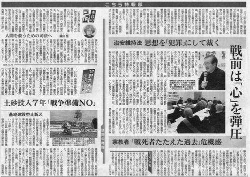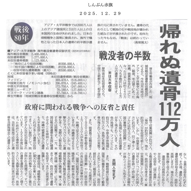 ![]() 12月29日情報 賛皆さま 2025年はがんばりました! 2026年も力を合わせていきましょう! ★①jpメールマガジン025-066(抜粋) ★②12/28 北区スタンディング報告 ★③12/29 新聞記事 ★④12/28 市民連合緊急声明発出 ★⑤1/31 9条の会事務局講演会 ★⑥2/7-8 壊すな!全国交流集会㏌呉 ★⑦【Zoom29】12月休み 2025アーカイブ ★⑧1/7-8 さようなら原発大発送 ★⑨1/19 19日行動、1/23 国会開会日行動 ~~~~~~~~~~~~~~~~ 平和を実現するキリスト者ネット http://cpnet.bona.jp 〒112-0002 文京区小石川2-17-41 富坂キリスト教センター2号館 304号室 ![]() e-mail:cpnet@mica.dti.ne.jp> ℡&Fax:03-3813-2885 ~~~~~~~~~~~~~~~~ 添付資料 新あつい壁上映会 kure_0207_2 ★①jpメールマガジン025-066(抜粋) 2025.12.24 p025-066 正義と平和協議会メール情報 ***jp***jp***jp***jp***jp***jp***jp*** 日本カトリック正義と平和協議会からのお知らせです。 1.STOP!死の商人国家 「5類型」撤廃による武器輸出全面解禁を許さない! 自民・維新 申し入れアクション(2025.12.25 東京)添付1 2.高市早苗首相の靖国神社参拝「緊急抗議行動」(2025.12.27 東京)添付2 3.映画『新・あつい壁』上映会(2026.1.10 東京)添付3 4.第255回ミャンマーを覚える祈り会(2025.12.26 オンライン・毎週金曜日) 今年もお世話になりました。ご降誕の喜びのうちに、よい新年をお迎えください。 日本カトリック会館は12月27日から1月5日まで休館になります ***jp***jp***jp***jp***jp***jp***jp*** 1.2.4.省略させていただきました。 平和ネット 3.映画『新・あつい壁』上映会(2026.1.10 東京)添付3 現在、熊本地方裁判所において、ハンセン病患者への死刑が執行された菊池事件の再審請求が行われており、この1月に裁判所の判断が示される予定です。 ハンセン病への偏見がどのようにして冤罪を生んだのか、ハンセン病患者に対する裁判がどれほど常軌を逸したものだったかを知るために、菊池事件を題材とした映画『新・あつい壁』を上映し、再審請求の審理の状況について弁護団から報告して頂くとともに、ハンセン病家族の菊池事件への思いを聞きます。ぜひご参加ください。 日時:2026 年1 月10 日(土)13:00~16:00 ごろ、12:30 開場 内容:映画『新・あつい壁』上映(111 分) 菊池事件再審請求の解説(30 分)<講師:菊池事件再審弁護団 金丸哲大 弁護士> ハンセン病家族からの発言(10 分) 中山節夫監督の挨拶(10 分) 場所:カトリック麹町聖イグナチオ教会 ヨセフホール JR 中央線/ 東京メトロ 丸の内線・南北線 四ツ谷駅下車( 定員:200 名・申込不要 参加費500 円(資料代) 主催 菊池事件の再審実現をめざす東京連絡会 共催 高麗博物館ハンセン病と朝鮮人研究会、ハンセン病首都圏市民の会、 全生園の明日をともに考える市民の会、カトリック東京正義と平和の会 風を紡ぐ会 お問い合せ先 kikuchi-saishin@shutoken.org ***jp***jp***jp***jp***jp***jp***jp***jp***jp** *平和をつくりだす宗教者ネット 「戦争する国」に反対し、脱原発・共謀罪廃止を求める 要請書 (毎月署名できます) http://www.shukyosha9jonowa.org/news/youbou201706_n1.pdf *『憲法改悪を許さない全国署名』 (正義と平和協議会とりまとめの署名用紙はこちらからダウンロードできます) https://www.jccjp.org/wordpress/wp-content/uploads/2022/01/No-kaiken-syomei.pdf *平和、いのち、くらしを壊す 大軍拡、大増税に反対する請願署名 (正義と平和協議会とりまとめの署名用紙はこちらからダウンロードできます) https://www.jccjp.org/wordpress/wp-content/uploads/2023/03/daigunkakuhantai.pdf ***jp***jp***jp***jp***jp***jp***jp***jp***jp** 日本カトリック正義と平和協議会 Japan Catholic Council for Justice and Peace TEL 03-5632-4444 FAX 03-5632-7920 〒135-8585 東京都江東区潮見2-10-10 カトリック中央協議会 jccjp@cbcj.catholic.jp https://www.jccjp.org Facebook https://www.facebook.com/seigitoheiwa ★②12/28 北区スタンディング報告 昨日は、恒例の第4日曜日の王子駅前スタンディングの今年の最終行動でした。 こばとさんが撮ってくれた動画です。 https://youtu.be/wogPBPSbQy8 つくし ★③12/29 新聞記事 皆様 新聞記事をお送りいたします。 合掌 武田隆雄 拝 「平和をつくり出す宗教者ネット」事務局 〒150-0045 渋谷区神泉町8-7 日本山妙法寺内 TEL 03-3461-9363 FAX 03-3461-9367 nqh10948@nifty.com https://twitter.com/syukyosyanet https://www.facebook.com/syukyosyanet/ ★④12/28 市民連合緊急声明発出 https://shiminrengo.com/archives/8045 市民連合緊急声明 【市民連合緊急声明 2025年12月28日】私たちは憂慮します――歯止めなき「戦争準備」に抗して ★⑤1/31 9条の会事務局講演会 〓市政権の改憲策動に抗して 〓市政権の新たな改憲の動きにしっかりと向き合い、戦争準備にストップをかけるために、私たちがなすべきことについて学び合う講演会を企画しました。どうぞ、ふるってご参加ください。 【日 時】:2026年1月31日 (土) 18時30分~ (開場は18時) 【場 所】:文京区民センター 3-A会議室 〒113-0083 東京都文京区本郷4-15-14 ℡03-3814-6731 <アクセス>丸ノ内線 「後楽園駅」 4bまたは5番出口徒歩6分/南北線「後楽園駅」 5番出口徒歩6分 都営三田線・大江戸線「春日駅」 A2出口徒歩2分/JR中央総武線「水道橋駅」 徒歩10分 【報告1】 渡 辺 治 