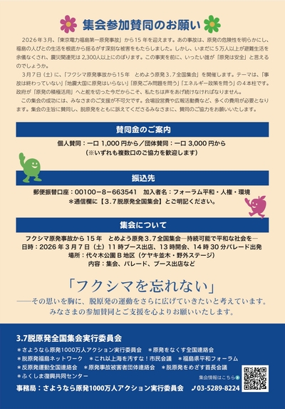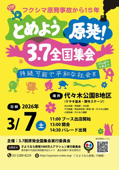 12月19日情報 賛同者 の皆様いよいよ「新しい戦前」から「戦争マジか」に? 2件お知らせします。 ★①【必見情報】防衛大生の靖國神社集団参拝 ★② 3・7脱原発全国集会 ~~~~~~~~~~~~~~~~ 平和を実現するキリスト者ネット http://cpnet.bona.jp 〒112-0002 文京区小石川2-17-41 富坂キリスト教センター2号館 304号室 e:mail:cpnet@mica.dti.ne.jp> ℡&Fax:03-3813-2885 ~~~~~~~~~~~~~~~~ ★①【必見情報】防衛大生の靖國神社集団参拝 各位、お元気ですか。 下記ご覧ください。防衛大生の千鳥ヶ淵、靖國神社、集団参拝です。 当局は、自発的な私的参拝で問題なしとしていますが、これが自発的な参拝でしょうか。 横須賀ら、九段まで夜を徹して歩き、事前に用意されたバスで制服に着替え、集団参拝後はバスで寝ながら帰るようです。 https://www.youtube.com/watch?v=HAaP5IREusc 弁護士 内 田 雅 敏 ************************************************* ![]() 〒160-0008 東京都新宿区四谷三栄町3番14号 三栄ビル3階 四谷総合法律事務所 (TEL)03-3355-2841 (FAX)03-3351-9256 uchida-masatoshi@mbm.nifty.com ************************************************* ★② 3・7脱原発全国集会 フクシマ原発事故から15年 とめよう原発!3・7全国集会 ~持続可能で平和な社会を~ 2026年3月7日(土)代々木公園B地区 11:00~ ブース出店開始(ブース出店者募集中) 13:00~ 開会 14:30~ パレード出発 賛同金募集中 個人1口¥1000~ 団体1口¥3000~ ご協力ください。 各地の再稼働、新増設に反対していきましょう! |
