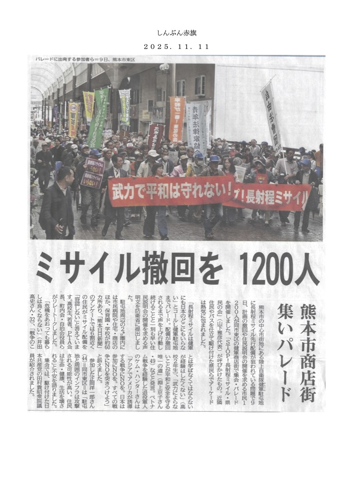 11月4日情報 賛同者の皆様 7件お知らせします。 ★①11・3憲法集会の新聞記事 ★②jpメールマガジン ★③11/13 ハチ公前行動 ★④矯風会より2件 ★⑤市民連合声明:高市政権誕生によせて ★⑥外キ協メール便 11月号 ★⑦JR顔認証カメラシステム停止について ★⑧『スパイ防止法反対!日米同盟強化による軍拡を許すな!11・19国会議員会館前行動』 ~~~~~~~~~~~~~~~~ 平和を実現するキリスト者ネット http://cpnet.bona.jp 〒112-0002 文京区小石川2-17-41 富坂キリスト教センター2号館 304号室 e-mail:cpnet@mica.dti.ne.jp> ℡&Fax:03-3813-2885 ~~~~~~~~~~~~~~~~ 添付資料 11.04赤旗 1106死刑廃止セミナー ハチ公前連続祈念行動ちらし 11.13連続祈念行動ちらし 1115林陽子さん講演会 原子力基本法改悪について 外キ協メール便 JR東日本顔認証停止 ★①11・3憲法集会の新聞記事 宗教者ネットより新聞記事 皆様 昨日の憲法集会の記事をお送りいたします。 合掌 武田隆雄 拝 「平和をつくり出す宗教者ネット」事務局 〒150-0045 渋谷区神泉町8-7 日本山妙法寺内 TEL 03-3461-9363 FAX 03-3461-9367 nqh10948@nifty.com https://twitter.com/syukyosyanet https://www.facebook.com/syukyosyanet/ ★②jpメールマガジン 2025.11.04 p025-057 正義と平和協議会メール情報 ***jp***jp***jp***jp***jp***jp***jp*** 1.第37回死刑廃止セミナー「死刑という制度と奪われた日常―家族に刻まれる見えない刑」(2025.11.6 滋賀、オンライン配信)添付1 2.渋谷ハチ公前第38回連続祈念行動 (2025.11.13 東京) 添付2 ***jp***jp***jp***jp***jp***jp***jp*** 1.第37回死刑廃止セミナー「死刑という制度と奪われた日常―家族に刻まれる見えない刑」(2025.11.6 滋賀、オンライン配信)添付1 「死刑を止めよう」宗教者ネットワーク 第37回死刑廃止セミナー「死刑という制度と奪われた日常 ――家族に刻まれる見えない刑」 日 時:2025年11月6日(木)18:00~20:0 会 場:日本キリスト教団 大津教会(滋賀県大津市末広町6−6) アクセス⇒アクセス/コンタクト – 日本キリスト教団大津教会 ※会場に駐車場はございません。 講 師:松本麗華 (Matsumoto Rika)さん 1983年、松本智津夫の三女として誕生。父は後に、麻原彰晃を名乗り、オウム真理教の教祖になる。 大学で心理学を学び、2015年に手記『止まった時計』(講談社)を出版し、自らの体験を社会に公表した。 以降、実名で活動を続け、メディア出演や講演、執筆を通じて社会との対話を重ねている。 著書に『被害者家族と加害者家族 死刑をめぐる対話』(2023年 共著 岩波ブックレット)、 『加害者家族として生きて』(2025年 創出版)があり、個人としての歩みを発信し続けている。 ※3冊の著書は、当日会場でも販売します。 資料代:500円(会場参加の方のみ。申し込みは不要です) 配 信:オンライン配信もございます。申し込み不要、参加無料です。 下記のURL からYouTubeのライブ配信をご視聴ください。 https://tinyurl.com/m9yzn885 主 催:「死刑を止めよう」宗教者ネットワーク https://www.facebook.com/shikei.tomeyou/ 問合せ:shikei.tomeyou@gmail.com 2.渋谷ハチ公前第38回連続祈念行動 (2025.11.13 東京)添付2 憲法9条を守ろう!スパイ防止法反対!―誰もがファースト、デマ・差別を許しませんー だれも殺すな!パレスチナ・ウクライナ・ミャンマーの市民のいのちを救おう! すべての宗教者・市民は、大同団結し、戦争の原因をつくり出すデマ・差別に反対し、パレスチナ・ウクライナ・ミャンマーの市民の命を救うため、祈り 行動してまいりましょう。また、現代の治安維持法である「スパイ防止法」に反対しましょう。 憲法9条を持つ日本政府は、すべての戦争に反対し、対話による平和外交を展開するよう求めてまいりましょう。 日時 11月13日(木)16時〜17時 場所 渋谷ハチ公前広場(交番前付近) ※都合により場所を近くに移動する場合があります。 ※プラカード・のぼり・横断幕をご持参ください。 目に見えるかたちで祈り訴えてまいります。 呼びかけ 平和をつくり出す宗教者ネット/日本カトリック正義と平和協議会/平和を実現するキリスト者ネット/基地のない沖縄をめざす宗教者の集い (連絡先:090−6711−5573(江上)) -- ***jp***jp***jp***jp***jp***jp***jp***jp***jp** *平和をつくりだす宗教者ネット 「戦争する国」に反対し、脱原発・共謀罪廃止を求める 要請書 (毎月署名できます) http://www.shukyosha9jonowa.org/news/youbou201706_n1.pdf *『憲法改悪を許さない全国署名』 (正義と平和協議会とりまとめの署名用紙はこちらからダウンロードできます) https://www.jccjp.org/wordpress/wp-content/uploads/2022/01/No-kaiken-syomei.pdf *平和、いのち、くらしを壊す 大軍拡、大増税に反対する請願署名 (正義と平和協議会とりまとめの署名用紙はこちらからダウンロードできます) https://www.jccjp.org/wordpress/wp-content/uploads/2023/03/daigunkakuhantai.pdf ***jp***jp***jp***jp***jp***jp***jp***jp***jp** 本メールは配信専用です。お問い合わせは下記までお願いいたします。 日本カトリック正義と平和協議会 Japan Catholic Council for Justice and Peace TEL 03-5632-4444 FAX 03-5632-7920 〒135-8585 東京都江東区潮見2-10-10 カトリック中央協議会 jccjp@cbcj.catholic.jp ★③11/13 ハチ公前行動 皆
