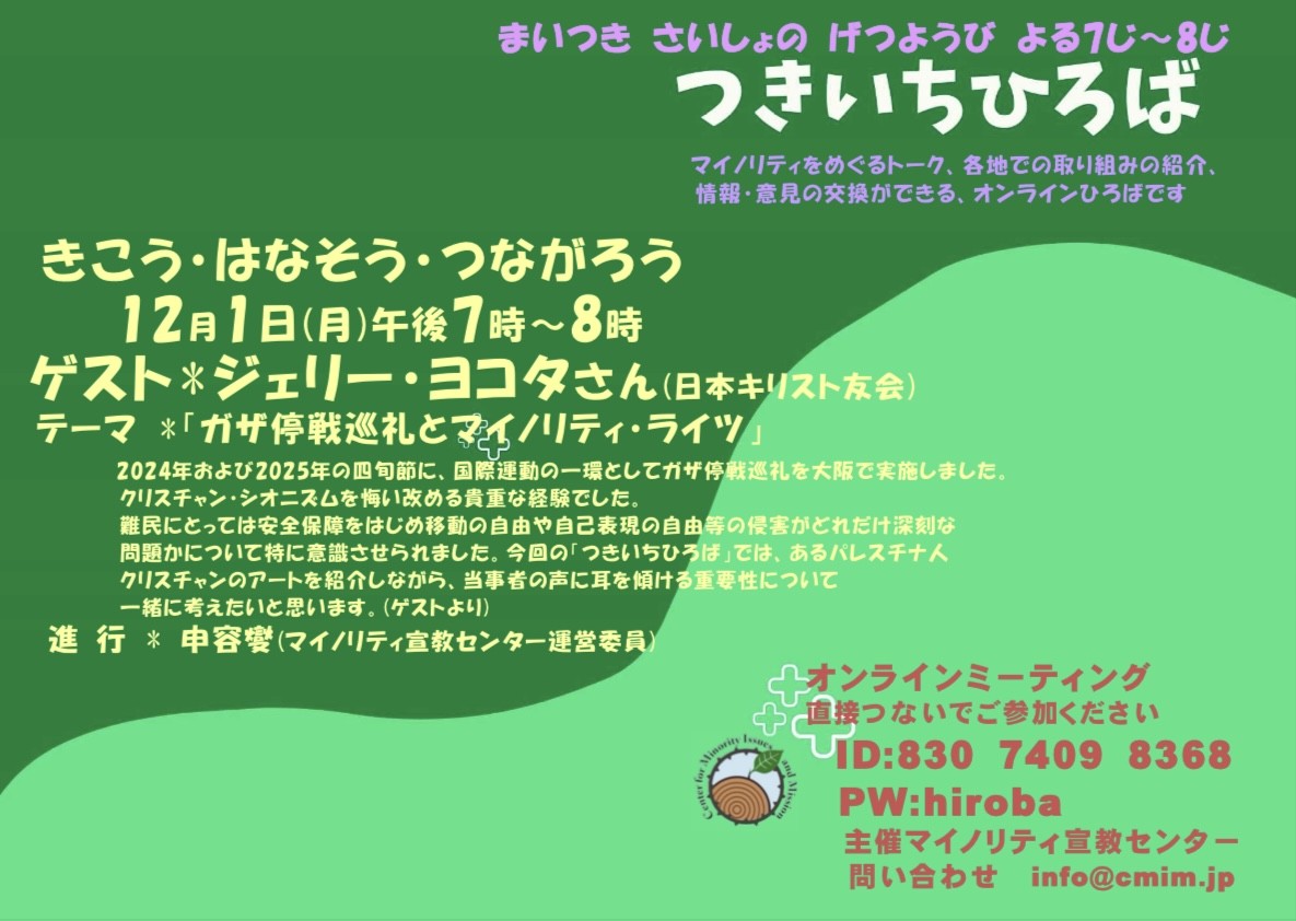 11月25日情報 ![]() 賛同者の皆様 ★12月1日つきいちひろばのお知らせを 追加します。 ~~~~~~~~~~~~~~~~ 平和を実現するキリスト者ネット http://cpnet.bona.jp 〒112-0002 文京区小石川2-17-41 富坂キリスト教センター2号館 304号室 e:mail:cpnet@mica.dti.ne.jp> ℡&Fax:03-3813-2885 ~~~~~~~~~~~~~~~~ ★12月1日つきいちひろばのお知らせ みなさま マイノリティ宣教センターより、12月の「つきいちひろば」の 案内を申し上げます。 12月1日(月)午後7時~8時 今回のゲストはジェリー・ヨコタさん(日本キリスト友会)です。 お時間のゆるされる方、ぜひご参加ください。 CMIM主事 吉高叶 トピック: つきいちひろば 時刻: こちらは定期的ミーティングです いつでも Zoom ミーティングに参加する https://us06web.zoom.us/j/83074098368?pwd=NWRJZXNHWHFyYmNmSDZwbVlkYXJ1QT09 ミーティング ID: 830 7409 8368 パスコード: ***** |