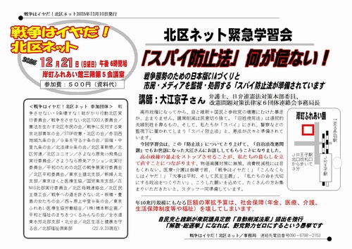 ![]() 12月8日情報 賛同者の皆様 たくさんあります、がんばりましょう! ★①12/9柏崎刈羽院内集会 ★②12/11スパイ院内集会、12/13講演会 ★③12/15武器輸出署名提出 ★④12/15官邸前 ★⑤12/16柏崎署名提出 ★⑥12/21スパイ学習会 ★⑦宗教者核燃裁判メールマガジン ~~~~~~~~~~~~~~~~ 平和を実現するキリスト者ネット http://cpnet.bona.jp 〒112-0002 文京区小石川2-17-41 富坂キリスト教センター2号館 304号室 e:mail:cpnet@mica.dti.ne.jp> ℡&Fax:03-3813-2885 ~~~~~~~~~~~~~~~~ 添付資料 251209質問文案 251215武器輸出署名提出集会 柏崎刈羽原発をめぐる市民集会 新潟県民ネットワーク12月呼びかけ仮ちらし訂 ★①12/9柏崎刈羽院内集会 【12.9院内ヒアリング集会】東電柏崎刈羽6号機再稼働の危険性(9日(火)13時~16時、参議院議員会館) いよいよ明日に柏崎刈羽の院内ヒアリング集会を開催します。 原子力規制庁のご担当に出席していただきます。 会場が狭く制約がありますが多くの方々の参加・視聴を呼びかけます。 末尾にご参加の案内(オンライン会議室などの案内)を添えました。 また、提出済の質問書を添付します。 【院内ヒアリング集会】 東電柏崎刈羽6号機再稼働の危険性 日時 2025年12月9日(火) 13時00分~16時00分 会場 参議院議員会館 議員第1会議室(1階) 進行 1 事前学習会 (13時15分~13時45分) 東電柏崎刈羽6号機再稼働へ動き 東電の原発稼働資格 柏崎刈羽6号機プラントの問題点 柏崎刈羽原発の地震・津波想定の問題点 柏崎刈羽原発の避難計画の問題点 福島健康被害と「7つの約束」 2 ヒアリング (14時00分~15時30分) 1 セキュリティ対策の欠陥を抱えたままの再稼働 2 制御棒駆動機構のトラブルについて 3 GTGの停止・運転制限の逸脱について 4 特定重大事故等対処施設(特重)の設置未了原子炉の再稼働問題 5 地震・津波リスクについて 6 柏崎刈羽原発の避難計画の問題点 出席要請:原子力規制委員会 紹介:参議院議員 福島みずほ議員事務所 主催:再稼働阻止全国ネットワーク 質問者:山崎久隆、木村雅英ほか 主旨: 原発は、現在の科学技術で制御できる装置でないことを、14年余り前の福島第一原発事故が大きな犠牲の上に教えている。これまで、私たちは原発は行き場なく危険な核のゴミを地球上に排出するばかりか、ひとたび事故が起こればあらゆる生き物に深刻な被害を及ぼす、それゆえ原発(核発電)は稼働をするべきでないと主張してきた。しかしながら、政府・経産省・原子力規制委員会は安全性を確認の上で原発稼働と強弁し、今14基の原発を稼動させている。 多くの人に深刻な被ばく被害を与えた311事故は未だに全く終わらず廃炉の姿も定かでなく汚染水を海洋投棄し続け自宅に戻れない方々が多数いて今も日本は原子力緊急事態宣言下にある。事故を起こした東京電力は事故後も「3つの誓い」を守れず、多くの不祥事を起こし、原子力規制委員会が指示した「7つの約束」も守れていない。さらに、昨年元日に能登半島地震があり、7号機に核燃料を装填したが稼働できずに1年半近く経過して取り出し、今6号機の再稼働を目論んでいるが次々に多くのトラブルが発生。ところが、新潟県民の強い反対の声にもかかわらず県知事の「地元同意」が今注目されている。 私たちは、昨年1月、4月、8月に院内ヒアリング集会を実施して、再稼働は余りに危険、東電が柏崎刈羽再稼働することは許されないと訴え続けてきた。 私たちの指摘に反論できなかった原子力規制庁は今も東電との面談を繰り返しており、柏崎刈羽6号機の再稼働をこのままでは容認できない状況にあると私たちは考える。 私たちは改めて原子力規制委員会にヒアリングし、審査・面談の状況を確認し、再稼働の危険性を訴える。 ご参加について 〇直接参加 会議室の定員が少ないので参加される方は事前にご連絡願います。 13時前に参議院議員会館ロビーにお出でください。 〇リモート参加 下記URLからご参加願います。 https://meet.jit.si/LeadingRepliesReleaseUpwards 問い合わせ ; 漆原(080-5646‐0794、beerlover365@gmail.com) 〇リモート聴講 下記でご覧ねがいます。 けいたろうツイキャス KEITAROU1212ちゃんねる https://twitcasting.tv/keitarou1212 〇UPLANpart3(三輪さん) 終了後にご覧いただけます。 不明点はすぐに出られないかも知れませんが 木村(080-5062-4196、kimura-m@ba2.so-net.ne.jp)にお願いします。 ★ ②12/11スパイ院内集会、12/13講演会 みなさま 12・11 「スパイ防止法」に反対する宗教者・信者緊急全国集会 .「スパイ防止法」から「明文改憲」への流れを断つ!! ■とき 12月11日(木)15時~17時 ■ところ 衆議院第二議員会館 第8会議室 ■内容 講演「スパイ防止法」から「明文改憲」への流れを断つ!! ■講師 小沢隆一さん(東京慈恵会医大科大名誉教授) ■連絡先 ●念仏者9条の会 ●平和を作り出す宗教者ネット ●日本カトリック正義と平和協議会 ●平和を実現するキリスト者ネット ・・・・・・・・・・・・・・・・・・・・・・・・・・・・・・ 12・13 小笠原みどりさん講演会 情報機関は何をやってきたのか ースノーデンの時代から高市政