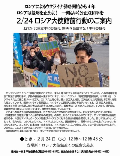 2月23日情報賛同者の皆様へ 本日17:00~首相官邸前ゴスペル ★①2/24ロシア大使館前行動12:00~ ★②2/24スパイ防止法反対国会前行動18:30~ ★③2/27ハチ公前行動 ★④2/28・3/1 3・1行動 ★⑤3/12宗教者ネット院内集会 ちなみに 2/24 ロシアのウクライナ侵攻4年「戦争になったら原発は標的になる」18:30~連合会館204 で司会をします。 ~~~~~~~~~~~~~~~~ 平和を実現するキリスト者ネット http://cpnet.bona.jp 〒112-0002 文京区小石川2-17-41 富坂キリスト教センター2号館 e-mail:cpnet@mica.dti.ne.jp> ℡&Fax:03-3813-2885 ~~~~~~~~~~~~~~ 添付資料 20260301朝鮮独立ちらし 12.15韓国社会大会各委員会スタート 3.12宗教者集会 ★①2/24ロシア大使館前行動12:00~ ロシアによるウクライナ侵略開始から4年 ロシアは侵略を止めよ! 一刻も早く公正な和平を2/24ロシア大使館前行動のご案内 よびかけ:日本平和委員会、憲法9条壊すな!実行委員会 -- 高田健 <kenpo@galaxy.ocn.ne.jp> 東京都千代田区神田三崎町3-3-3 太陽ビル402市民ネット内 許すな!憲法改悪・市民連絡会 03-3221-4668 Fax03-3221-2558 http://web-saiyuki.net/kenpoh/ 戦争させない・9条壊すな!総がかり行動実行委員会 http://sogakari.com/ 憲法9条を壊すな!実行委員会 http://kyujokowasuna.com/ 九条の会事務局 mag@9jounokai.jp ★②2/24スパイ防止法反対国会前行動18:30~ みなさま 角田です。 24日夜、市民総監視のスバイ防止法・国家情報局反対の国会前行動をおこないます。 ご参加ください。 《拡散歓迎!》 ↓ ↓ ↓ 市民総監視のスパイ防止法・国家情報局法案反対!2.24議員会館前行動 ⬛日時:2月24日(火)18:30~19:30 ⬛場所:衆議院第2議員会館前 ⬛呼びかけ団体 経済安保法に異議ありキャンペーン、秘密保護法対策弁護団」、「秘密保護法」廃止へ!実行委、改憲問題対策法律家6団体連絡会、肉球新党、日本マスコミ文化情報労組会議(MIC) ~~~~~~~ 角田富夫 Tel03-3330-8270 ~~~~~~~~ ★③2/27ハチ公前行動 皆様 今月の渋谷・ハチ公前行動の案内をお送りいたします。合掌 武田隆雄 拝 「平和をつくり出す宗教者ネット」事務局 〒150-0045 渋谷区神泉町8-7 日本山妙法寺内 TEL 03-3461-9363 FAX 03-3461-9367 nqh10948@nifty.com https://twitter.com/syukyosyanet https://www.facebook.com/syukyosyanet/ ★④2/28・3/1 3・1行動 ●今度の土日3.1朝鮮独立運動107周年集会へ(2/28屋内集会、3/1新宿行動)既報ですが、3.1朝鮮独立運動107周年集会が今度の土日に迫りましたので再度のご案内です。 ◆ 高市の不意打ち解散・総選挙で衆院は自民単独3分の2超の危険な状況となりましたが、今こそ東アジア民衆の連帯を強め打ち返していきましょう。 ◆ また韓国ゲストのパク・ソグンさんの詳細な講演レジュメ(パワポ)と資料が届きましたが、あらためて韓国民衆の闘いに学ぶことが多いと思います。 多くの皆さまの参加・賛同を呼びかけます。 (※一番下に2/20現在の賛同一覧があります↓) 【拡散歓迎】 ***************************************************************** 2026 3.1朝鮮独立運動107周年 大軍拡と戦争国家の道、排外主義反対! 今こそ東アジアの平和な未来を! ***************************************************************** ■屋内集会 2月28日(土)午後2時開会(1時半開場) 文京区民センター2A(地下鉄春日or後楽園下車すぐ) 【講演】高市政権の大軍拡と戦争国家の道を問う(仮) 布施祐仁さん(ジャーナリスト) 【プロフィール】1976年東京都生まれのフリージャーナリストで、安全保障(外交・軍事)や戦争、日米同盟、自衛隊の海外派遣などを専門に取材・執筆活動。著書に『日米密約 裁かれない米兵犯罪』(岩波書店2010年4月)、『経済的徴兵制』(集英社新書2015年11月)、『従属の代償 日米軍事一体化の真実』(講談社現代新書2024年9月)など多数 【韓国ゲスト講演】尹錫悦の非常戒厳・内乱陰謀を打ち破り、 社会大改革に向かう韓国民衆 朴錫運さん(パク・ソグン=韓国進歩連帯常任共同代表、 社会大改革委員会委員長) 韓国では2024年末の尹錫悦の非常戒厳・内乱陰謀を市民・国会議員らの力で打ち破り、新たに李在明政権が誕生しましたが、2025年12月15日、さらに社会大改革に向けた市民社会・政党・政府を網羅する協議体として「社会大改革委員会」が発足しました。民衆生存権闘争の先頭に立ってきたゲストのパク・ソグンさんが委員長に指名されました。 【資料添付】 ■屋外集会 3月1日(日)午後2時開始(1時半集合) 新宿駅南口前 【リレートーク】 徴用工問題、「慰安婦」問題、関東大震災虐殺問題、朝鮮学校差別問題、 朝鮮戦争停戦協定73年問題、沖縄基地問題、改憲問題ほか ■主催「3.1朝鮮独立運動」日本ネットワーク(旧100周年キャンペーン) 連絡先 日韓民衆連帯全国ネットワーク(070-6997-2546) ピースボート(03-3363-7561) 日朝協会(03-3237-1991) 子どもと教科書全国ネット21(03-3265-7606) 在日韓国民主統一連合(03-4361-6357) 小川町企画(03-3818-6671) (順不同) ■【3・1独立運動103周年集会・行動への賛同をお願いします】 賛同費 個人(1口)1000円 団体(1口)3000円 郵便振替 00190-9-604110 口座名[3・1記念事業委員会] *3・1賛同と明記下さい。(なお氏名公表の可否、個人はあれば肩書も) --------------------------------